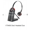 The VBET VT9400-Duo is a Wireless DECT GAP Duo Headset, designed to provide flexible connectivity to desk phone and softphone. It features noise-cancelling technology and has a range of up to 150 meters and up to 8 hours talk time. It also supports handset lifter or EHS for remote answer/end calls and can pair up to 4 headsets for conference calls. This headset is also compatible with softphone of 3CX and Skype for Business to hook on/off.
